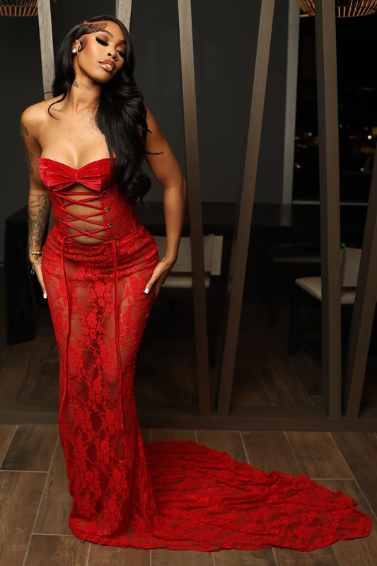 Cutout Front Lace Up Strapless Slim Fit Mermaid Hem Lace Maxi Dresses [In stock]